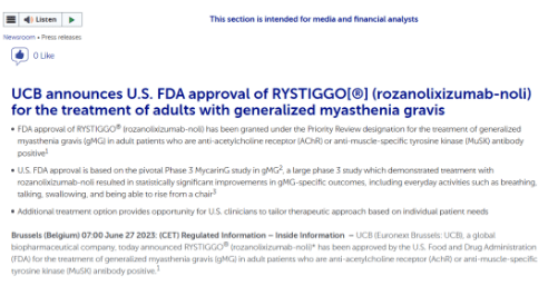 6月27日,优时比(UCB)宣布,美国FDA已批准该公司皮下注射靶向新生儿Fc受体(FcRn)单抗Rystiggo(rozanolixizumab)上市,用于治疗抗乙酰胆碱受体(AChR)或抗肌肉特异性酪氨酸激酶(MuSK)抗体阳性成人全身型重症肌无力(gMG)。