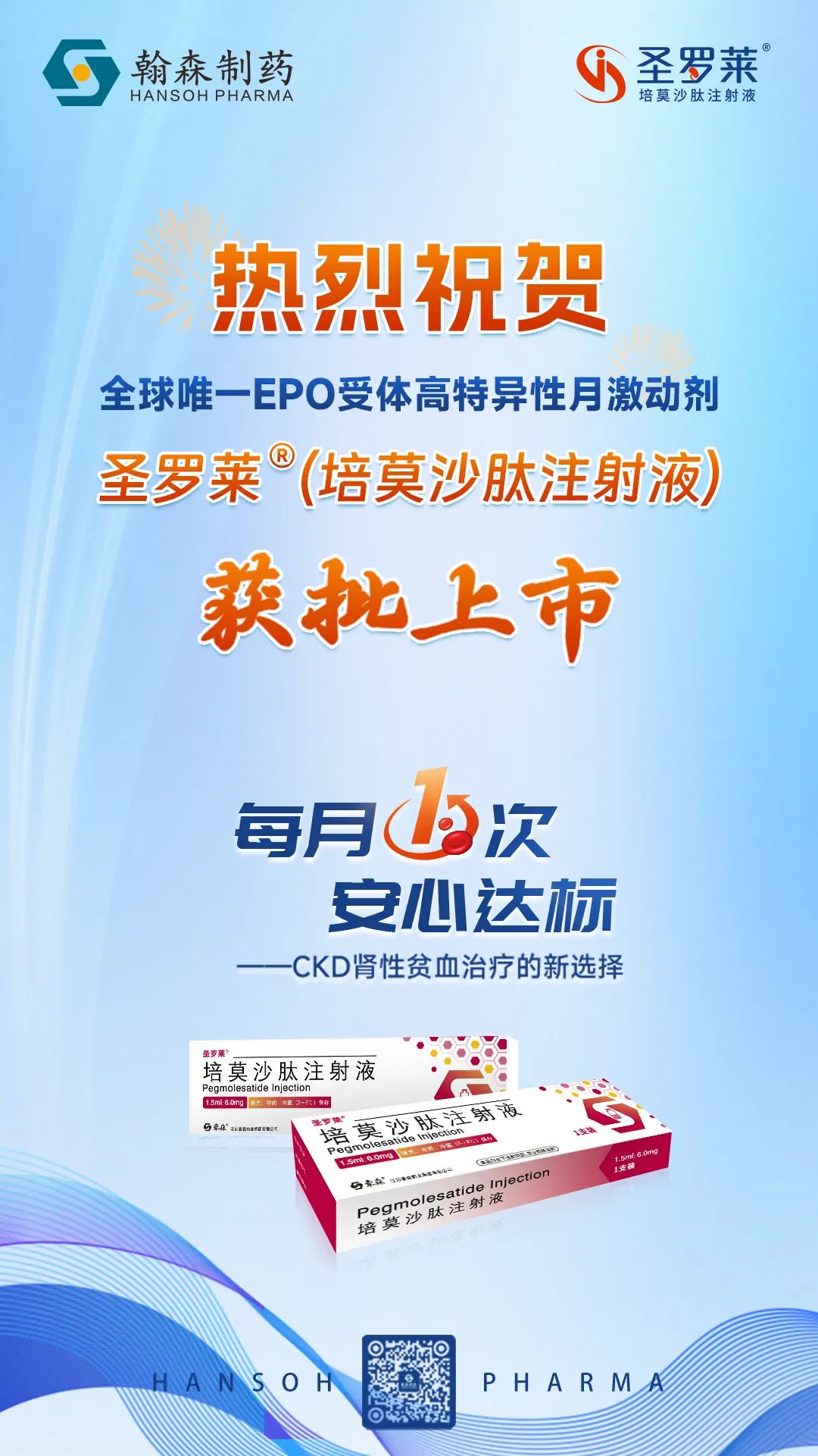 6月30日,翰森制药“全球唯一EPO受体高特异性小多肽月激动剂”圣罗莱®(培莫沙肽注射液)获国家药品监督管理局(NMPA)批准上市,适用于治疗因慢性肾脏病(CKD)引起的贫血,包括未接受红细胞生成刺激剂(ESA)治疗的成人非透析患者,及正在接受短效促红细胞生成素(EPO)治疗的成人透析患者。圣罗莱®成为翰森制药获批上市的第7款创新药。