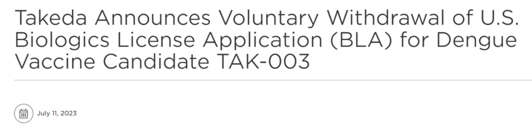 7月11日,武田宣布,在与FDA就数据收集方面的问题进行讨论后,已自愿撤回其登革热候选疫苗TAK-003的生物制品许可申请(BLA)。考虑到美国登革热流行地区民众的需要,武田将进一步评估TAK-003在美国的未来计划。