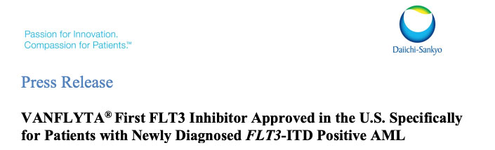 7 月 20 日,第一三共宣布,其在研新药 quizartinib(VANFLYTA®)获 FDA 批准上市,用于治疗 FLT3-ITD 突变新诊断急性髓细胞白血病(AML)成人患者。