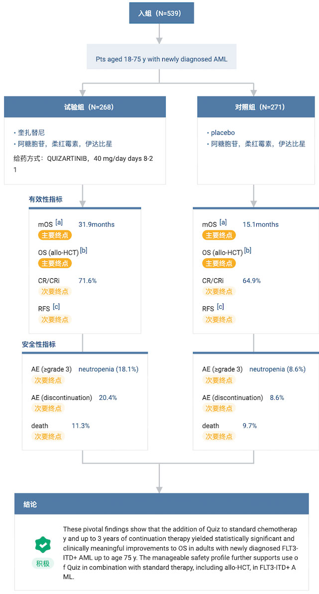 这是一项随机、双盲、安慰剂对照研究,共纳入了 539 名新诊断 FLT3-ITD 阳性 AML 患者,且按 1:1 被随机分配接受 quizartinib 或安慰剂联合标准诱导和巩固治疗后,继续接受单药维持治疗。