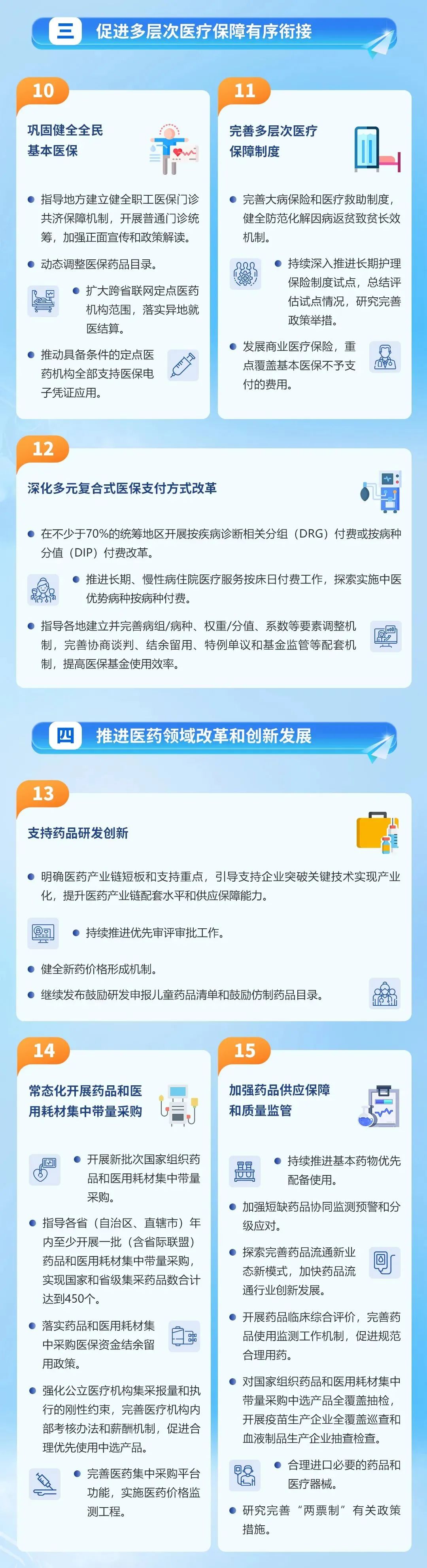 四是推进医药领域改革和创新发展。支持药品研发创新,常态化开展药品和医用耗材集中带量采购,加强药品供应保障和质量监管,确保“供好药”“用好药”。