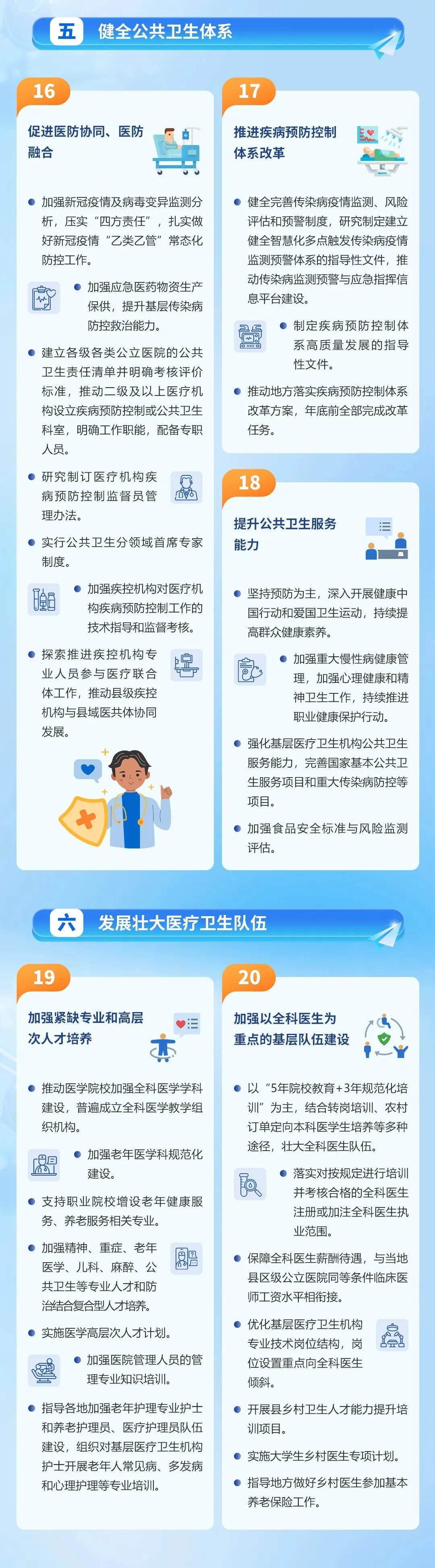 五是健全公共卫生体系。促进医防协同、医防融合,推进疾病预防控制体系改革,提升公共卫生服务能力,从制度完善、人才队伍建设、评价考核等多方面共同努力推动公共卫生体系建设和能力提升。深入开展健康中国行动和爱国卫生运动,持续提高群众健康素养。