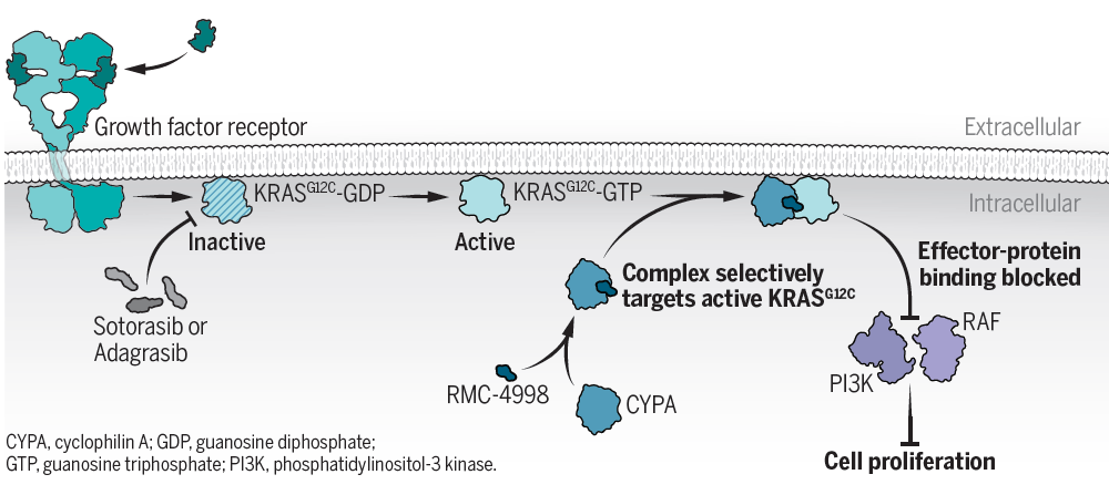 基于这一发现,研究团队尝试对与CYPA结合的天然产物进行改造,让它们能够介导CYPA与激活状态下的KRAS G12C突变体结合。经过多轮基于结构的化合物优化,研究人员发现了名为RMC-4998的候选分子胶化合物。它能够与CYPA和激活状态下的KRAS G12C突变体构成三元复合体。而且,与KRAS G12C结合的CYPA会阻断激活的KRAS突变体与下游效应蛋白产生相互作用,从而抑制促进细胞增殖的信号传导。