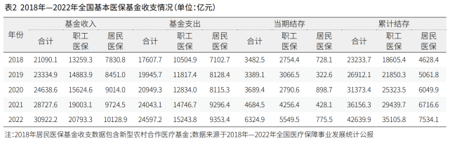 2022年,基本医疗保险基金(含生育保险)收入、支出分别为30922.2亿元、24597.2亿元,当期结存6324.9亿元,累计结存42639.9亿元。职工医保基金收支规模基本稳定,2022年基金收入20793.3亿元,支出15243.8亿元,当期结存5549.5亿元,累计结存35105.8亿元。居民医保基金收入规模不断扩大,2022年基金收入10128.9亿元,支出9353.4亿元,当期结存775.5亿元,累计结存7534.1亿元(见表2)。