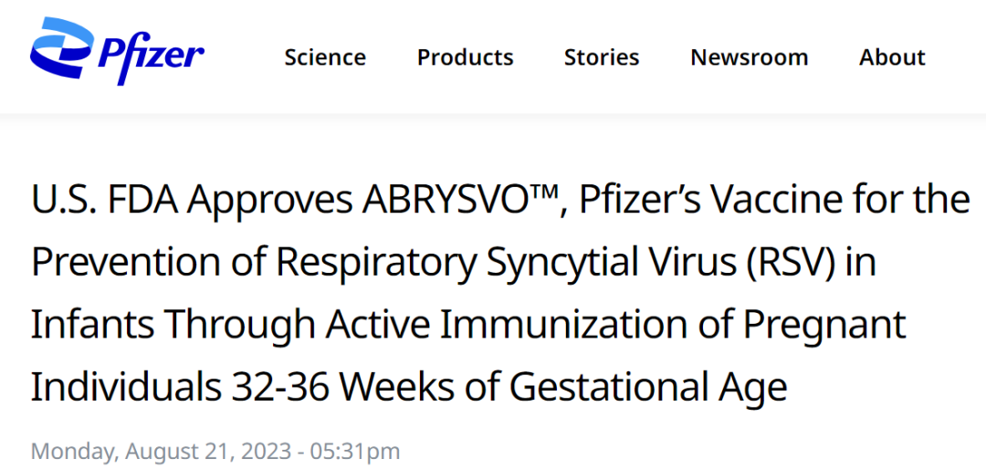 8月21日,辉瑞宣布FDA已批准其二价呼吸道合胞病毒(RSV)疫苗Abrysvo(RSVpreF,PF-06928316)新适应症上市,通过孕妇主动免疫,预防出生至6个月大的婴儿患上RSV相关下呼吸道疾病(LRTD),这是FDA批准的首款保护婴儿在出生至6个月内免受RSV引起的LRTD和严重LRTD的孕产妇接种疫苗。FDA已于2022年3月授予该疫苗突破性疗法资格认定,并于2023年2月授予其优先审评资格。