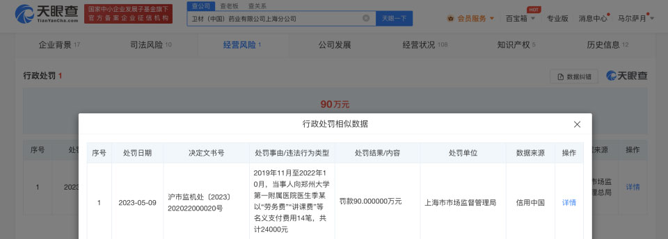 从天眼查App获悉,卫材(中国)药业有限公司上海分公司因给付医师财物的违法行为,违反药品管理法,被上海市市场监督管理局罚款90万元。