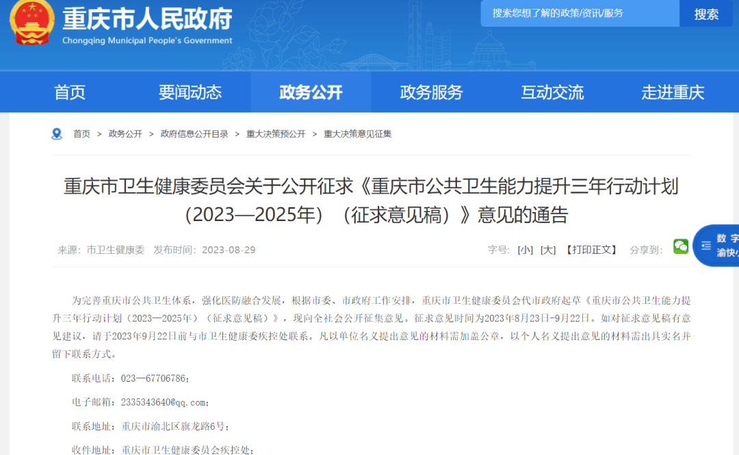 近日,重庆市人民政府网站发布重庆市卫健委关于公开征求《重庆市公共卫生能力提升三年行动计划(2023—2025年)(征求意见稿)》意见的通告》,其中明确指出要赋予公共卫生医师处方权,到2025年,全市获得处方权的公卫医师达到50—100人。