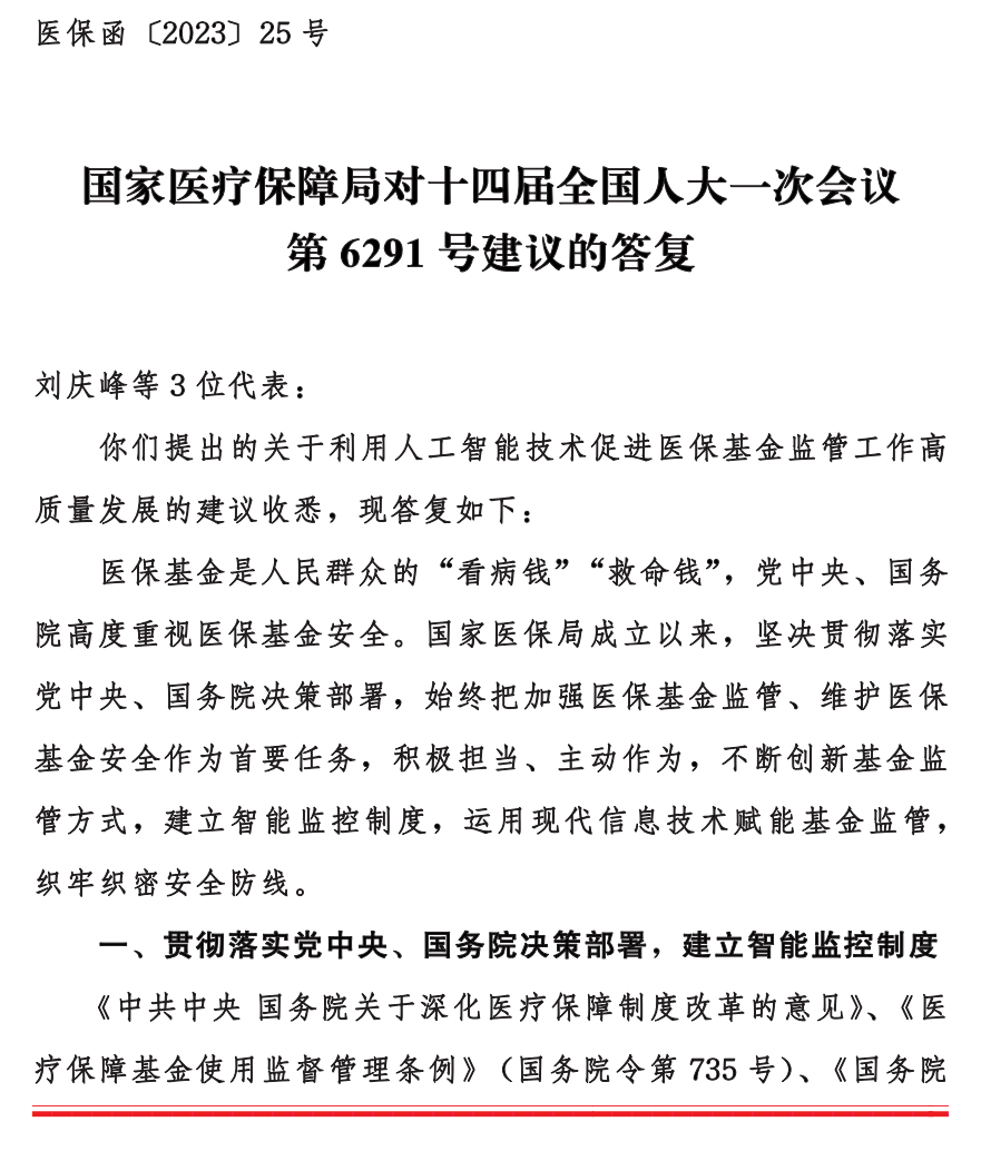 9月1日,国家医保局网站发布对十四届全国人大一次会议第6291号建议的答复。