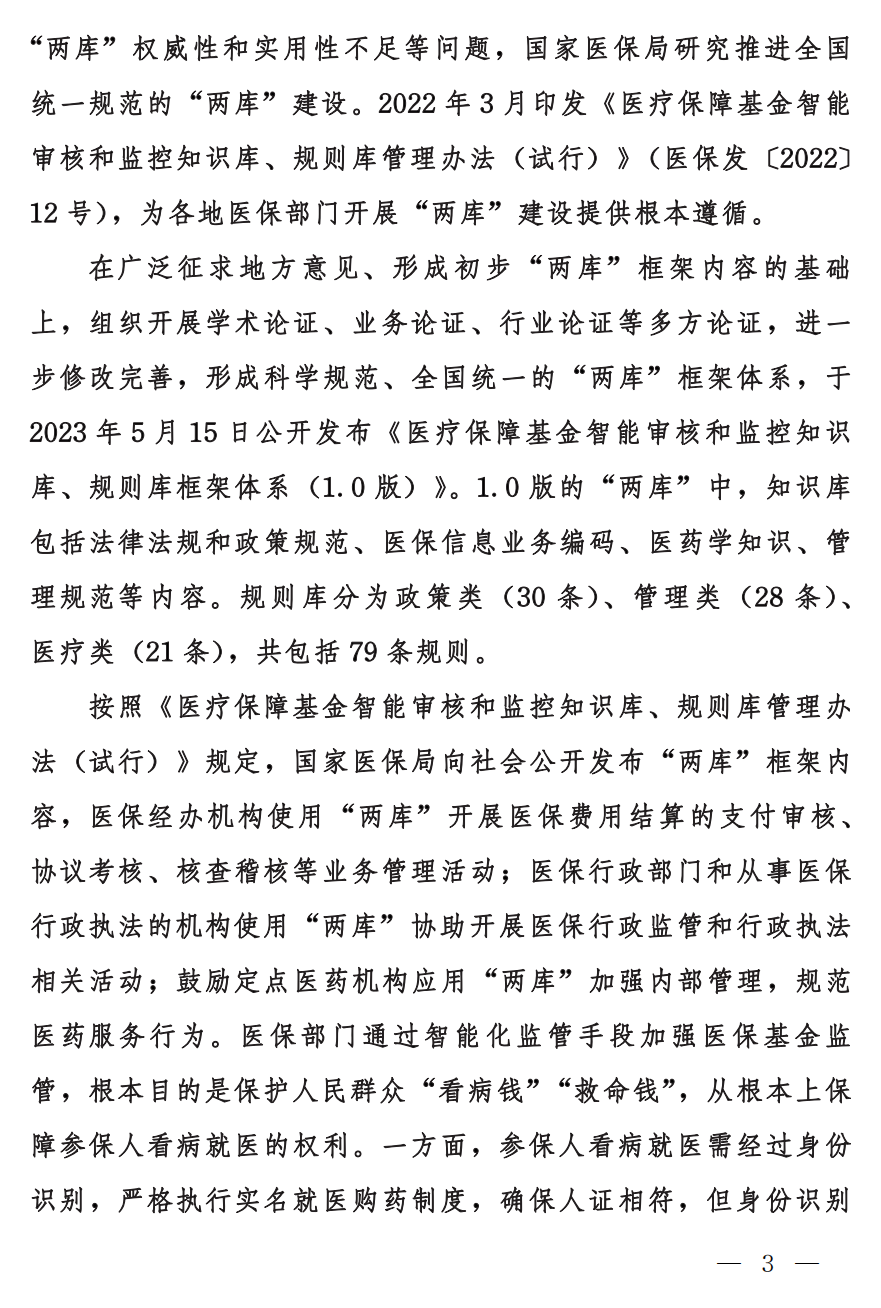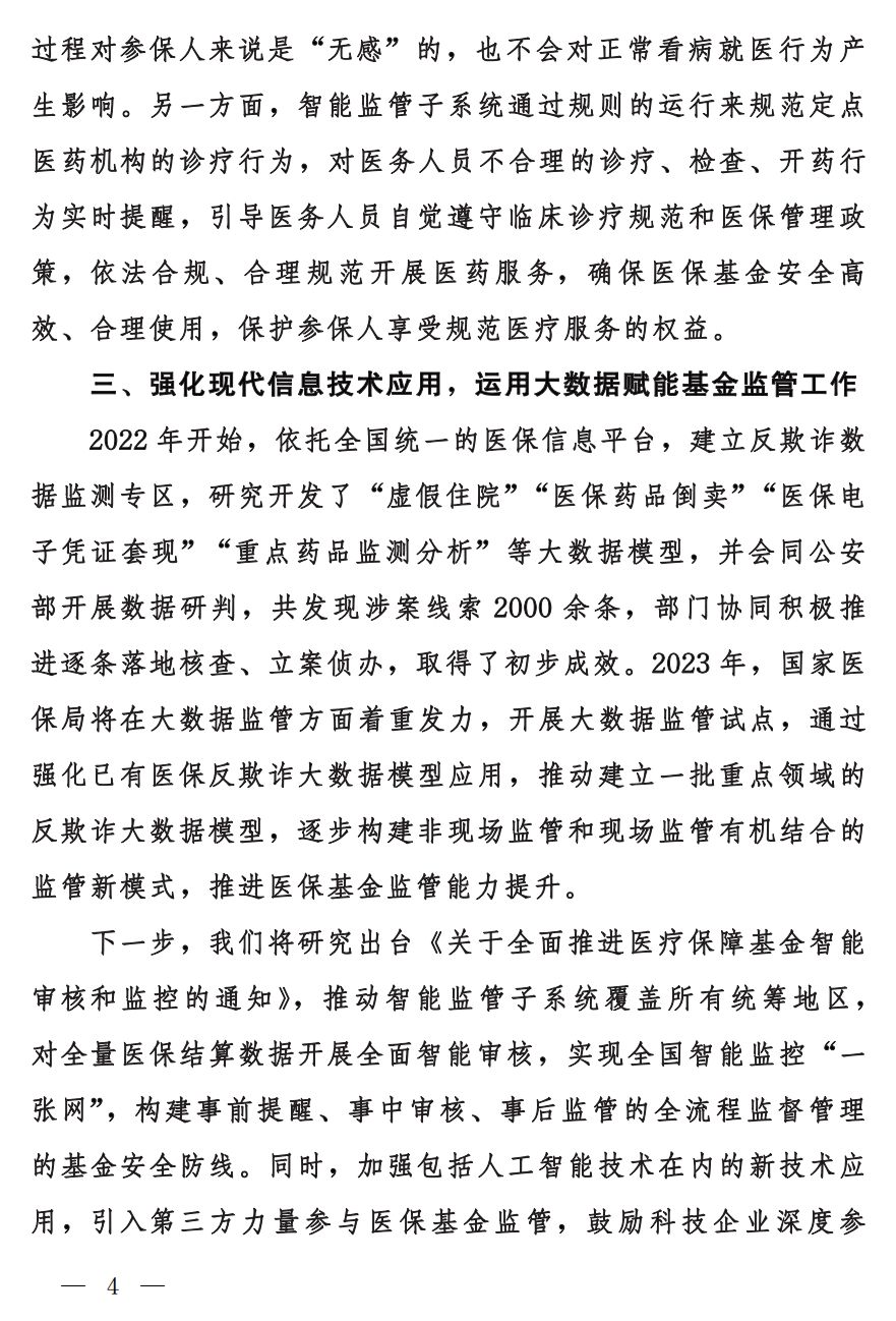下一步,国家医保局将研究出台《关于全面推进医疗保障基金智能审核和监控的通知》,推动智能监管子系统覆盖所有统筹地区,对全量医保结算数据开展全面智能审核,实现全国智能监控“一张网”,构建事前提醒、事中审核、事后监管的全流程监督管理的基金安全防线。同时,加强包括人工智能技术在内的新技术应用,引入第三方力量参与医保基金监管,鼓励科技企业深度参与,有效规范医疗服务行为,让人民群众享受到更加规范合理的医疗服务。