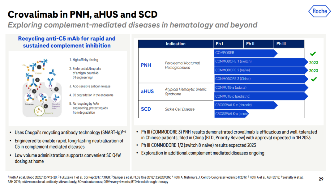 珂罗利单抗是罗氏通过连续单克隆抗体回收技术(Smart-Ig)工程化改造得到的一种新型可循环、靶向补体C5的单克隆抗体,相比于传统的C5抗体,其中和C5的时间更长。此外,珂罗利单抗的结合位点与现有C5疗法不同,可为携带R885H突变的PNH患者提供新的治疗选择。