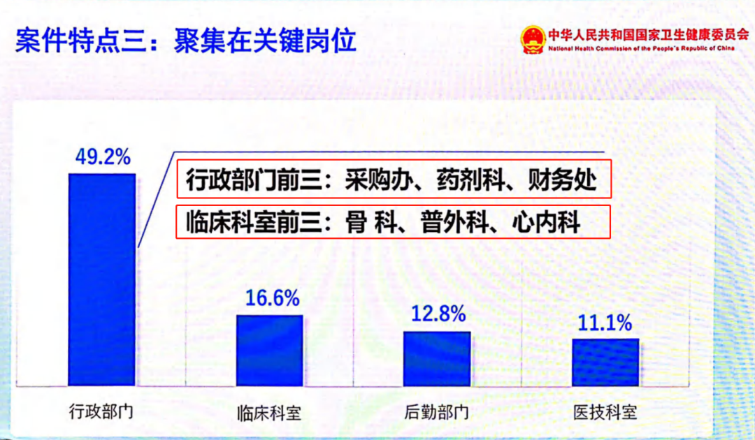器械采购占36.7%、药品采购占30.3%、耗材试剂采购占15.6%;商业贿赂、回扣、欺诈骗保是主要表现形式。