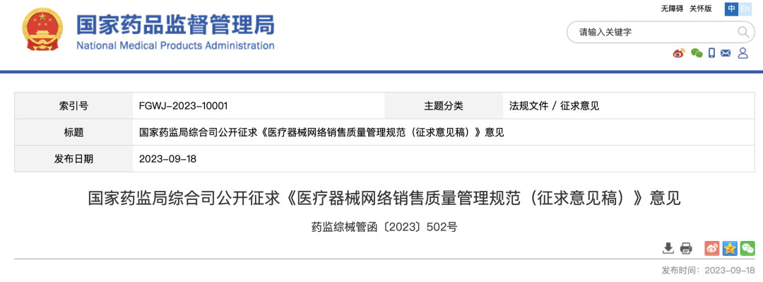 公开征求意见的时间是2023年9月15日—10月14日。有关单位和个人可以将意见反馈至qxjgec@nmpa.gov.cn,请在电子邮件主题注明“医疗器械网络销售质量管理规范—意见建议反馈”。