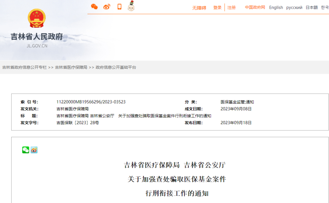 强化医保监管!又有省级文件出台了!近日,吉林省医疗保障局、吉林省公安厅联合发布了《关于加强查处骗取医保基金案件行刑衔接工作的通知》。