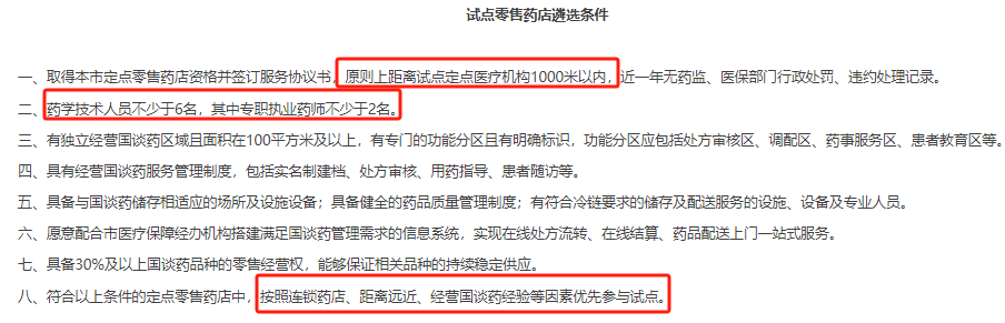 四是,明确了这些试点合作零售药店的遴选条件,并按照连锁药店、距离远近、经营国谈药经验等因素进行挑选。