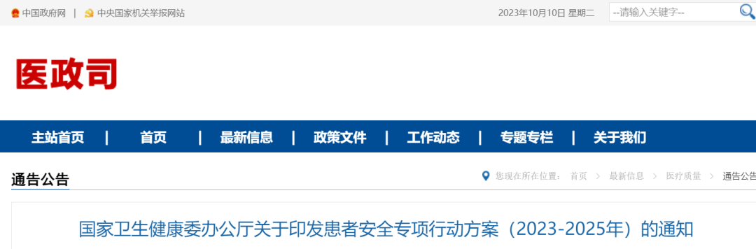 患者安全是医疗质量管理的底线和核心内容,也是患者对医院信任度和满意度的重要考量。在对《患者安全专项行动方案(2023-2025年)》的政策解读中,国家卫生健康委表示,当前患者安全管理能力和管理意识仍需进一步提高,医务人员主动报告不良事件例次、医院获得性指标总体发生率等指标与国际先进水平相比仍有一定差距。因此,国家卫生健康委将「患者安全专项行动」作为《全面提升医疗质量行动计划(2023-2025年)》(以下简称《行动计划》)的子行动进行了安排。由此,2023年10月9日,国家卫生健康委官网发布了《患者安全专项行动方案(2023-2025年)》(以下简称《行动方案》)。《行动方案》针对全国二级以上医疗机构,提出的行动目标为:利用3年时间,进一步健全患者安全管理体系,完善制度建设,畅通工作机制,及时消除医疗过程中以及医院环境中的各类风险,尽可能减少患者在医院期间受到不必要的伤害,保障患者安全。连续3年每年至少完成1轮全院巡检排查和全院患者安全专项培训,至2025年末,患者安全管理水平进一步提升,每百出院人次主动报告不良事件年均大于2.5例次,低风险病种住院患者死亡率进一步降低。