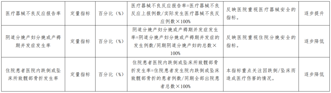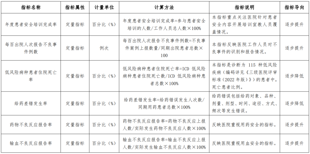 《行动方案》提出 9 项患者安全专项行动监测指标:年度患者安全培训完成率、每百出院人次报告不良事件例数、低风险病种患者住院死亡率、给药差错发生率、药物不良反应报告率、输血不良反应报告率、医疗器械不良反应报告率、阴道分娩产妇分娩或产褥期并发症发生率、住院患者医院内跌倒或坠床所致髋部骨折发生率。