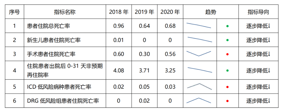 低风险病种患者住院死亡率用于衡量医院对住院患者所提供服务的安全和质量。在当前DRG医保支付方式改革下,全国相应 DRG 组病死率较低,一旦发生死亡,意味着死亡原因很可能与疾病本身的关系较低,而与医院的临床诊治管理过程相关度更高。