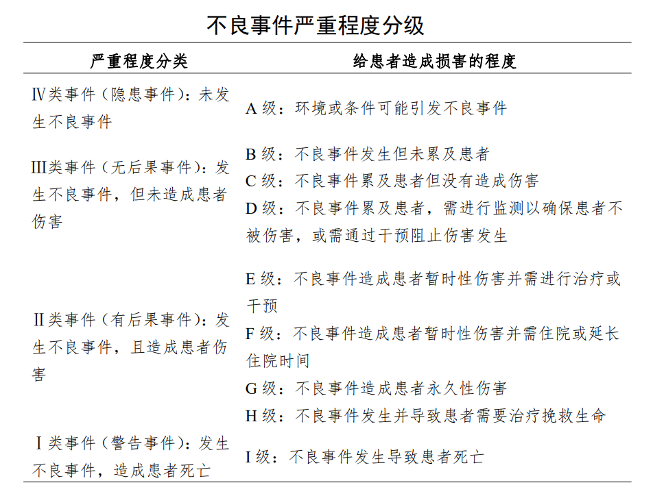 健康界注意到,医疗质量安全不良事件分级分类标准按照严重程度分为四类,分别是Ⅳ类事件(隐患事件)、Ⅲ类事件(无后果事件)、Ⅱ类事件(有后果事件)、Ⅰ类事件(警告事件),按照给患者造成损害的程度分成九级。