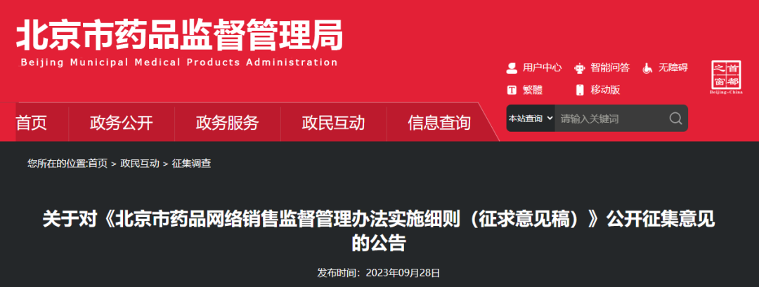 近日,北京市药监局发布关于对《北京市药品网络销售监督管理办法实施细则(征求意见稿)》(以下简称《意见稿》)公开征集意见的公告。