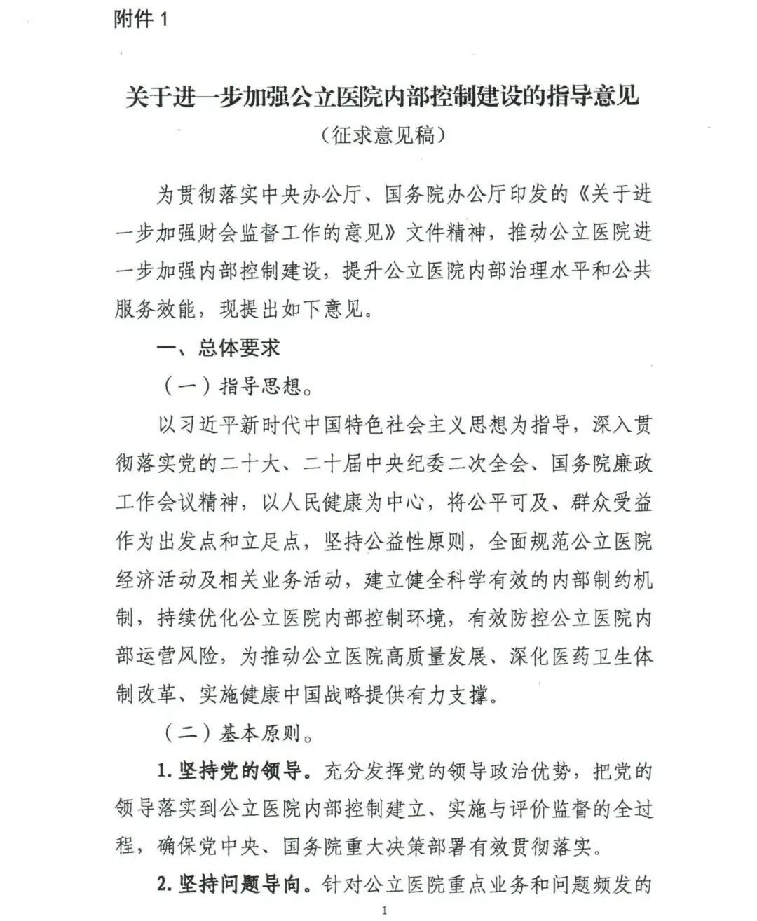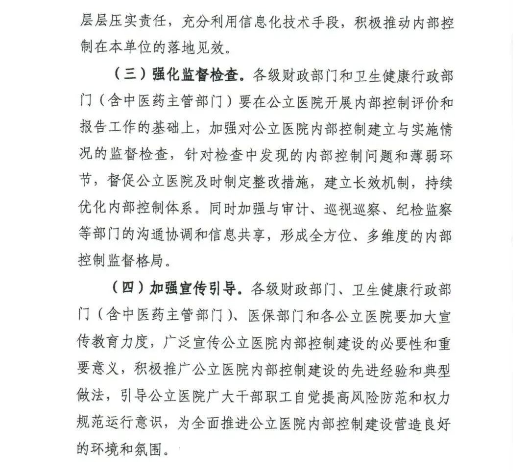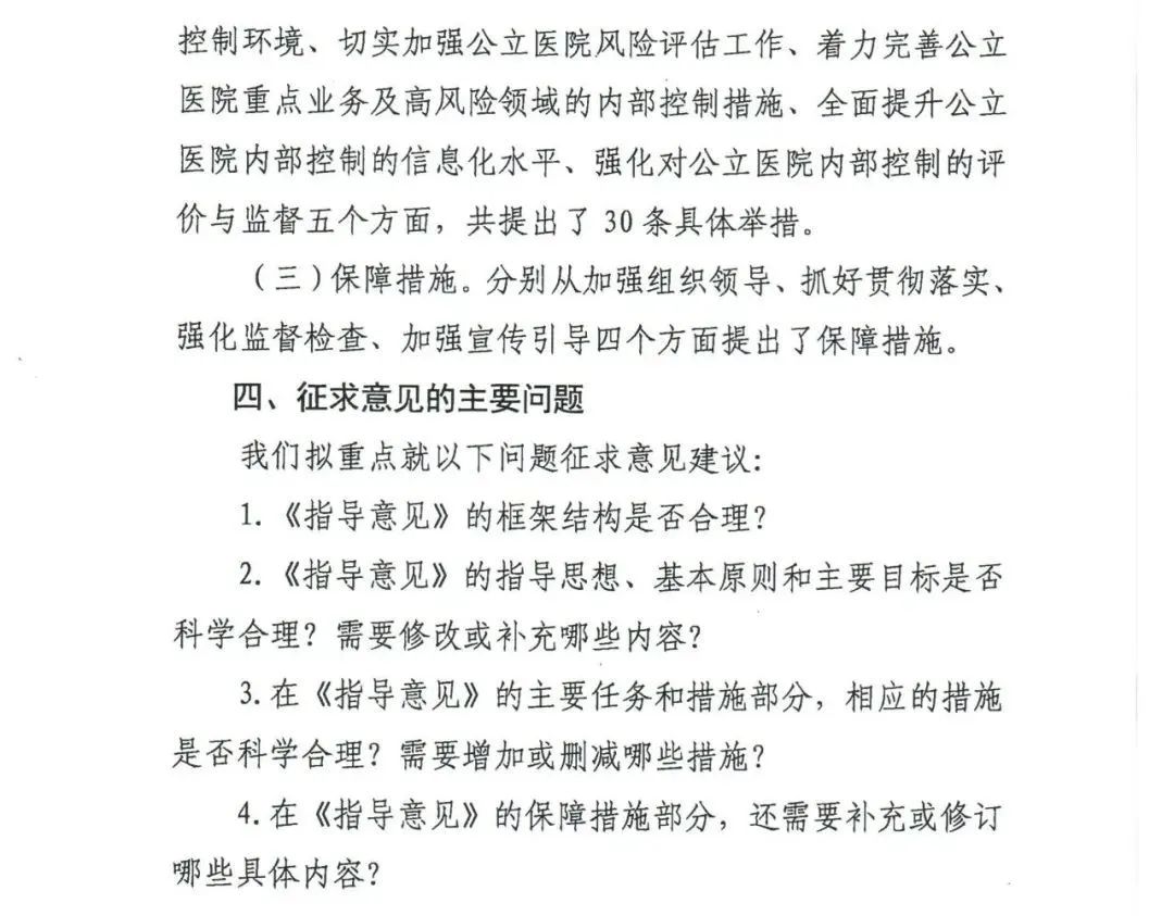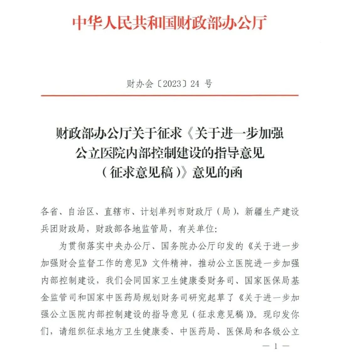 近日,财政部公布《关于进一步加强公立医院内部控制建设的指导意见(征求意见稿)》,提出主要5大任务和30项措施,推动公立医院加强内部控制建设,合理保证公立医院经济活动合法合规、资产安全和使用有效、财务信息真实完整,有效防范舞弊和预防腐败,提高资源配置和使用效益。