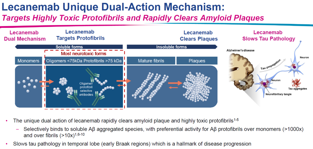 Lecanemab具有独特的双重作用机制,选择性结合Aβ聚集体,同时延缓Tau pathology。