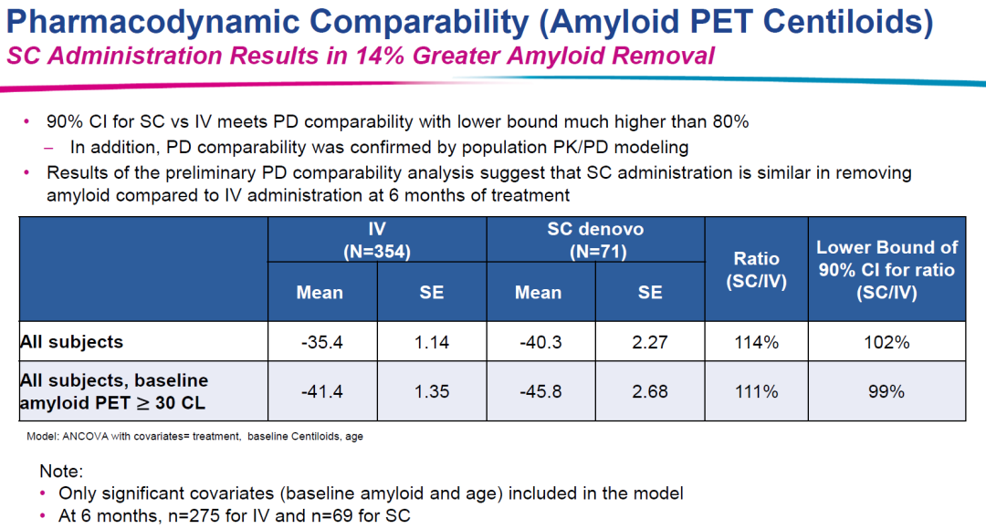 从药效学来看,皮下注射剂Amyloid下降幅度超过静脉注射剂14%。