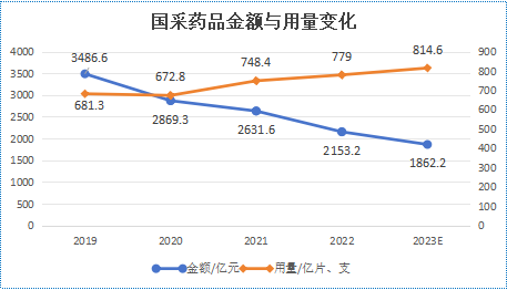 前八批集采药品中,第一批落地时间最长,已接近4年,第八批落地时间最短,仅1个季度。我们把这333种药品的采购总金额和总用量按年度统计,发现金额从2019年的3486.6亿元降至2023年的1862.2亿元,且逐年降低。用量则从681.3亿片/支增加至814.6亿片/支,且逐年增长。国采仿制药实现了“费降量增”,很好地实现了以价换量的政策目标。