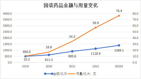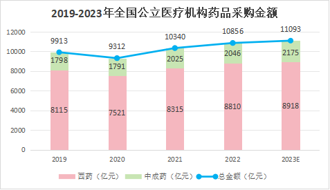 数据来源说明:全国医疗保障事业发展统计公报(2019-2022),IMS全国百张床位以上医院药品数据库(约占全国市场的65%)、彭博Bloomberg、万得Wind、知名证券公司行业研究分析报告。2023年数据为预测值,用前三个季度的数据乘以4/3得到。