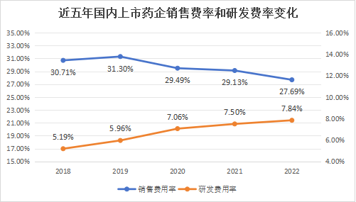 通过梳理国内80家最大医药上市企业年报数据发现,平均销售费率从2018年的30.7%降至2022年的27.7%。平均研发费率从2018年的5.2%增长至2022年的7.8%,尽管与大型跨国药企平均16%的研发费率还有不小差距,但仍有明显进步。