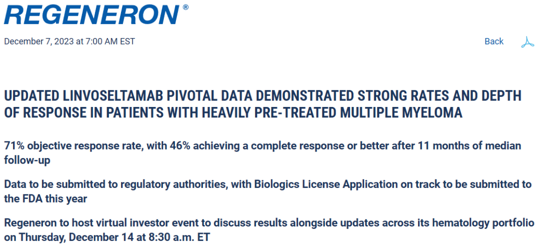 12月7日,再生元宣布关键I/II期LINKER-MM1试验的中期分析结果显示,接受BCMA/CD3双抗linvoseltamab治疗的复发/难治性(R/R)多发性骨髓瘤(MM)患者出现深度且持久缓解。在11个月的中位随访期间,独立审查委员会评估的客观缓解率(ORR)为71%,46%的患者实现完全缓解或更好疗效。再生元计划今年基于I/II期研究结果向美国FDA等监管当局递交生物制品许可(BLA)申请。