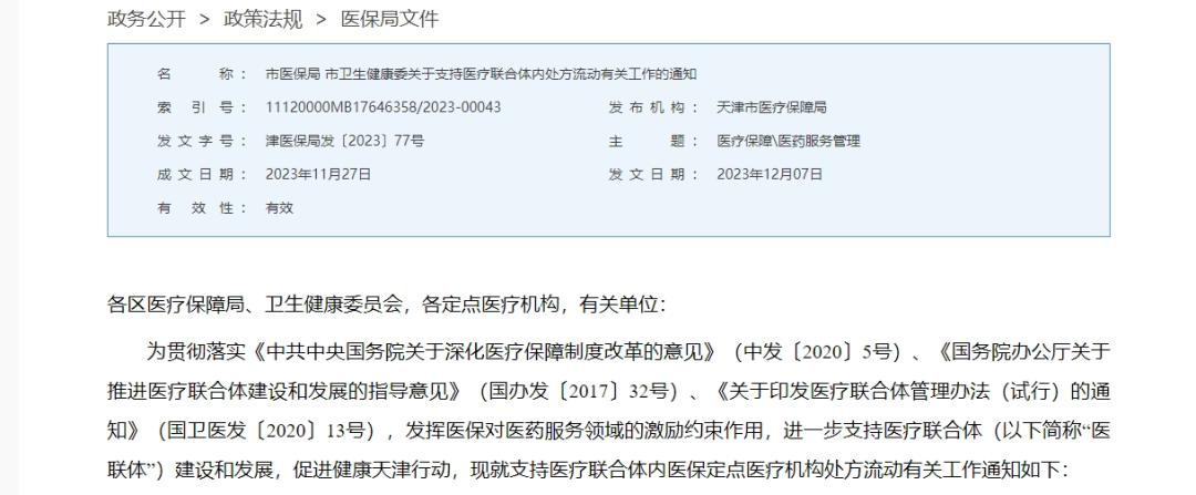 为发挥医保对医药服务领域的激励约束作用,进一步支持医疗联合体(以下简称“医联体”)建设和发展,促进健康天津行动,近日,天津市医保局、市卫生健康委发布关于支持医疗联合体内处方流动有关工作的通知。