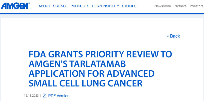 12 月 13 日,安进宣布,其在研 DLL3/CD3 双抗 Tarlatamab 的 BLA 申请获 FDA 受理并获优先审评资格,针对晚期 NSCLC。PDUFA 决定日期在 2024 年 6 月 12 日。