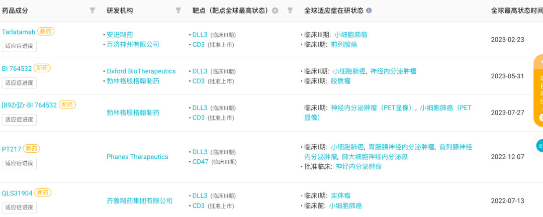 全球进入临床阶段 5 款靶向 DLL3 的双特异性抗体