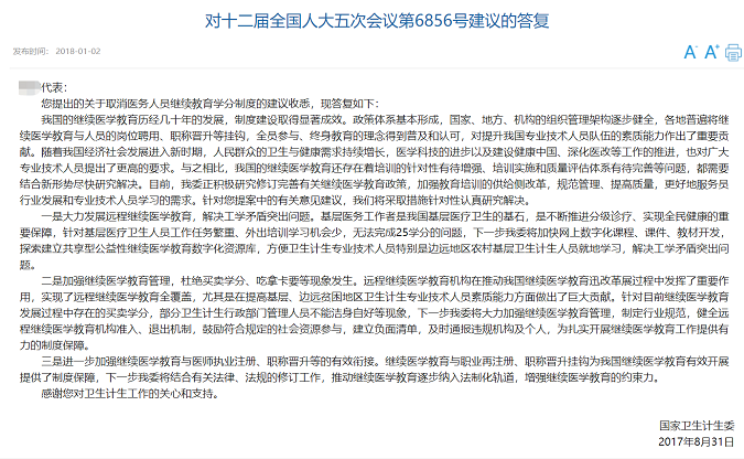 在2017年的全国两会上,一些人大代表和政协委员提出了关于取消医务人员继续教育学分制度的建议和提案。针对这一议题,国家卫生计生委作出了回应,表示将采取一系列措施加强继续医学教育的管理,并杜绝买卖学分、吃拿卡要等不良现象。