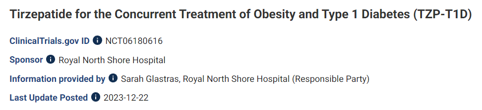 近日,ClinicalTrials.gov官网登记了一项Tirzepatide(替尔泊肽)治疗同时患有1型糖尿病和肥胖的受试者的II期临床试验。