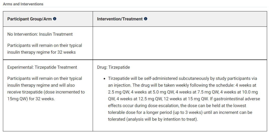 该研究开始时间是2024年3月,结束时间是2025年7月。主要终点是受试者体重变化,次要终点包括糖化血红蛋白(hbA1c)水平、每日胰岛素总剂量、腰围和颈围、血压等。替尔泊肽是一款每周注射一次的GIPR和GLP-1R激动剂,2022年5月首次获FDA批准用于治疗2型糖尿病,今年11月扩展肥胖适应症。