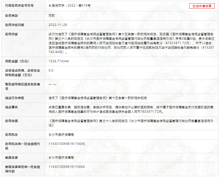 2022年11月28日,长沙市中心医院因重复收费、超标准收费、串换诊疗项目、提供其他不必要的医药服务、将不属于医疗保障基金支付范围的医药费用纳入医疗保障基金结算的行为共计造成医保基金损失金额人民币7633871.72元。