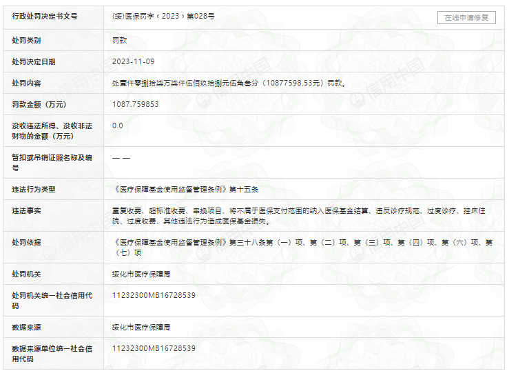 处壹仟零捌拾柒万柒仟伍佰玖拾捌元伍角叁分(10877598.53元)罚款。(绥)医保罚字﹝2023﹞第028号。