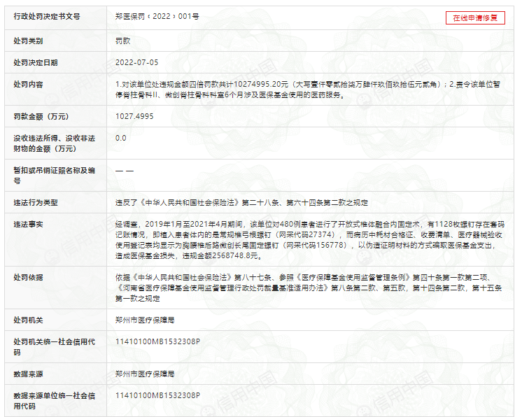 2022年7月5日,郑州市骨科医院因2019年1月至2021年4月期间,该单位对480例患者进行了开放式椎体融合内固定术,有1128枚螺钉存在套码记账情况,即植入患者体内的是常规椎弓根螺钉(网采代码27374),而病历中耗材合格证、收费清单、医疗器械验收使用登记表均显示为胸腰椎后路微创长尾固定螺钉(网采代码156778),以伪造证明材料的方式骗取医保基金支出,造成医保基金损失,违规金额2568748.8元。