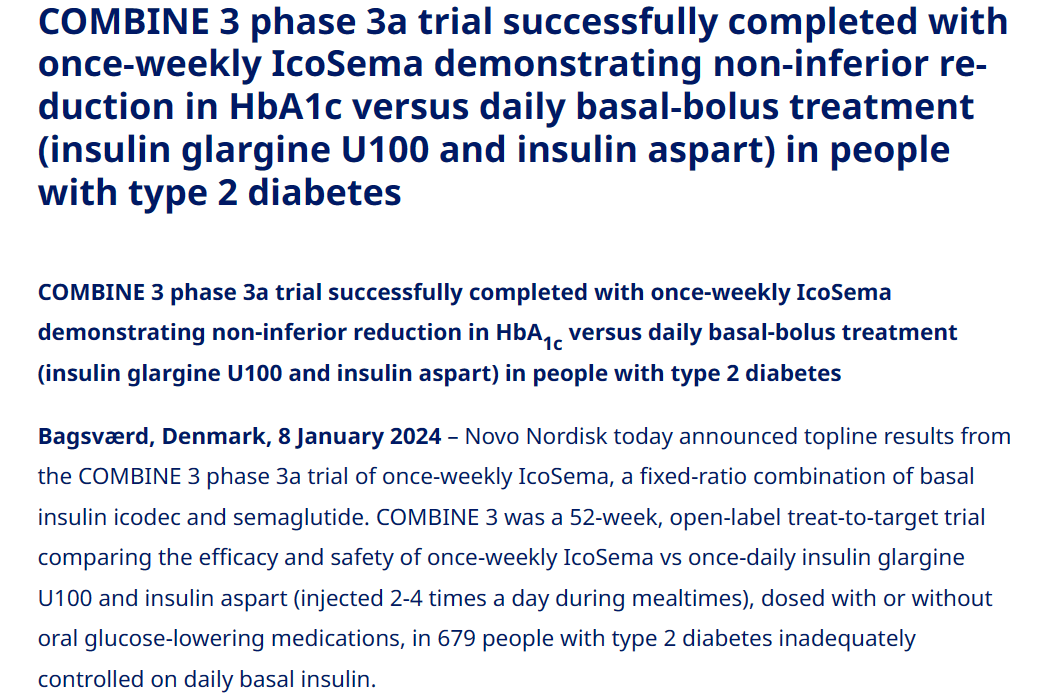1月8日,诺和诺德宣布每周1次IcoSema(基础胰岛素icodec和司美格鲁肽固定比例联合制剂)vs 基础胰岛素治疗2型糖尿病的IIIa期试验(COMBINE 3)达到主要终点。