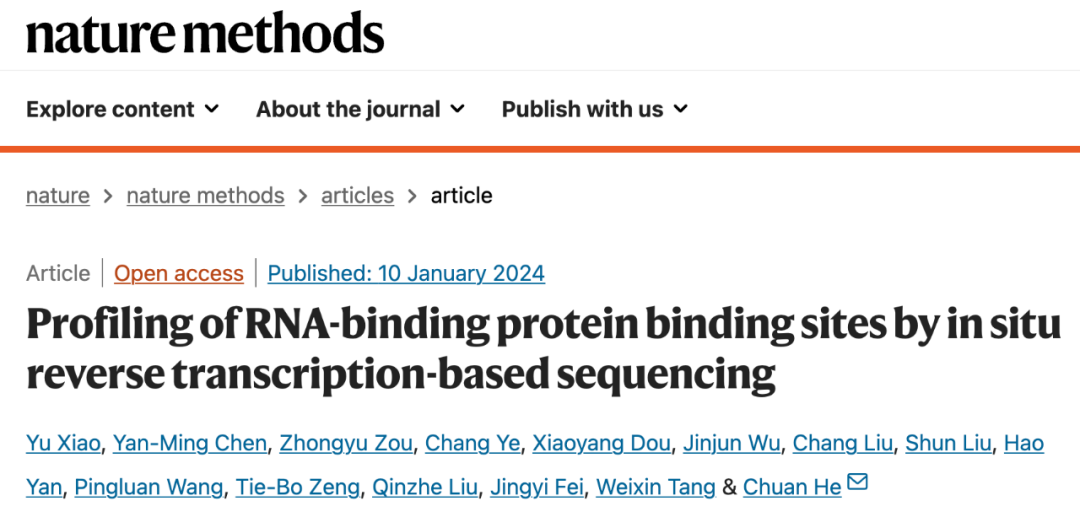 2024年1月10日,芝加哥大学何川教授团队在 Nature Methods 期刊发表了题为:Profiling of RNA-binding protein binding sites by in situ reverse transcription-based sequencing 的研究论文。
