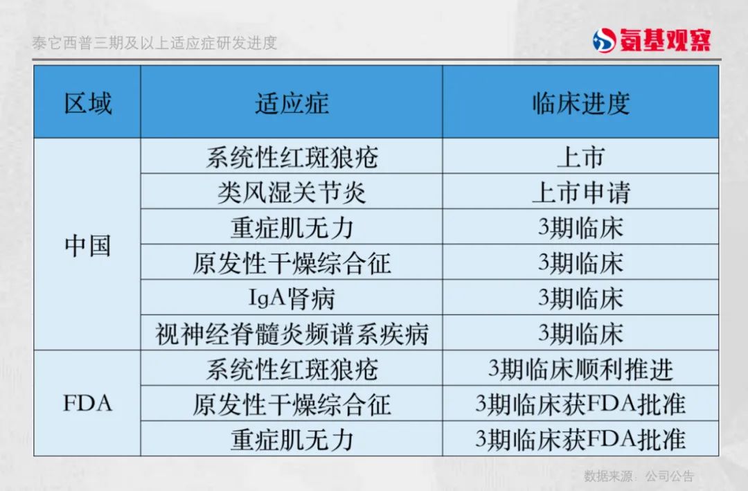 如上图所示,泰它西普的系统性红斑狼疮国际3期临床正在顺利推进,原发性干燥综合征、重症肌无力等适应症的3期临床已获FDA批准。