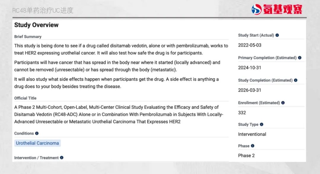 例如,RC48联用君实生物PD-1一线治疗尿路上皮癌的3期临床研究,已进入到最后的加速阶段,是目前全球尿路上皮癌一线治疗进展最快的靶向HER-2的ADC研究。