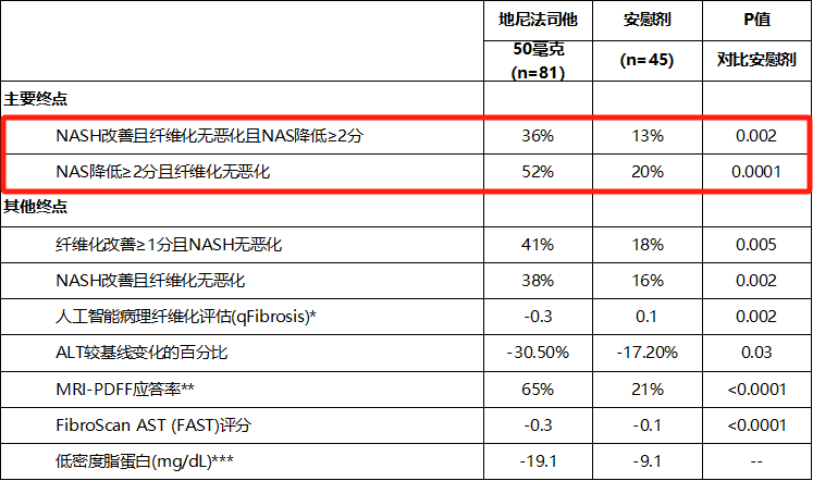 结果显示,两大主要终点均达到了统计学显著性差异的改善。次要终点中,与安慰剂组相比,治疗组患者的纤维化改善≥1期且NASH无恶化达到了统计学显著性差异,磁共振质子密度脂肪分数(MRI-PDFF)下降≥30%的应答者比例更高。安全性与耐受性与此前研究一致,未观察到与治疗相关的严重不良事件(SAE),大多数不良事件(AE)性质为轻至中度(1级和2级),无≥3级与治疗相关的AE。与Madrigal的Resmetirom、89 Bio的Pegozafermin非头对头相比,地尼法司他对于NASH以及肝纤维化有更强劲的疗效,具有BIC的潜力。