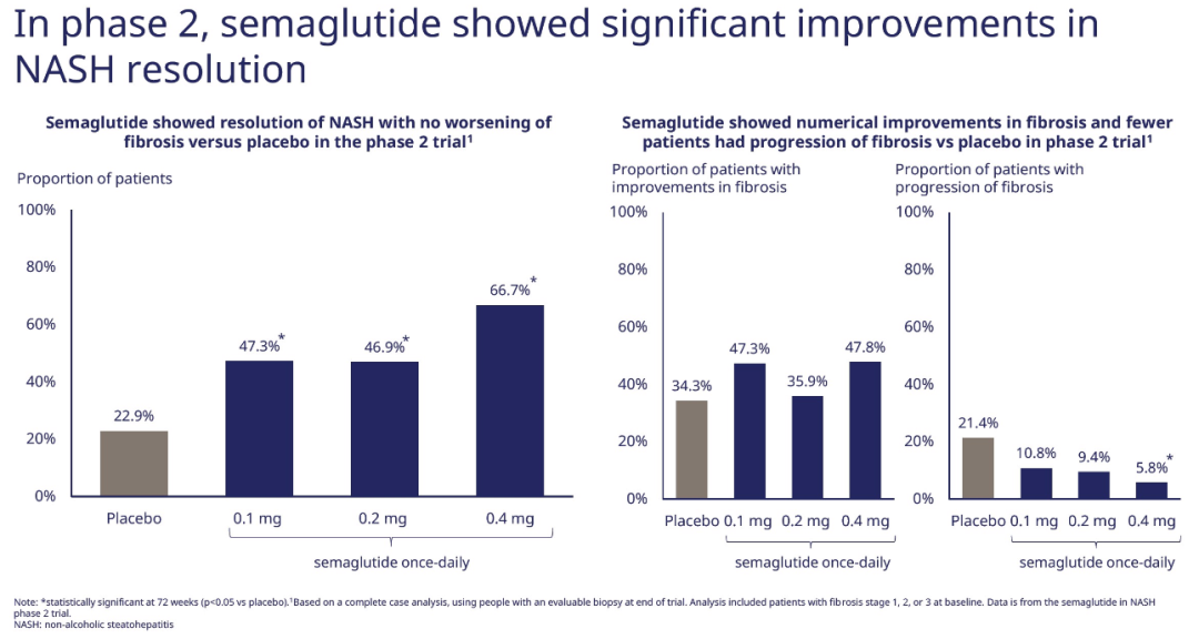 诺和诺德,礼来携各自GLP-1杀入,司美格鲁肽目前进展最快。此前一项在治疗NASH的2期临床结果显示司美格鲁肽0.1 mg、0.2 mg和0.4 mg治疗组分别有47.3%、46.8%和66.7%患者的NASH症状得到消除。