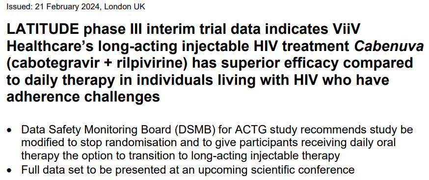 上周,DSMB进行了计划中的中期审查。他们综合考虑了所有研究终点,并得出结论,有证据表明长效抗逆转录病毒疗法Cabenuva的疗效优于标准日常口服ART治疗。DSMB建议对所有符合条件的受试者给予长效注射Cabenuva。