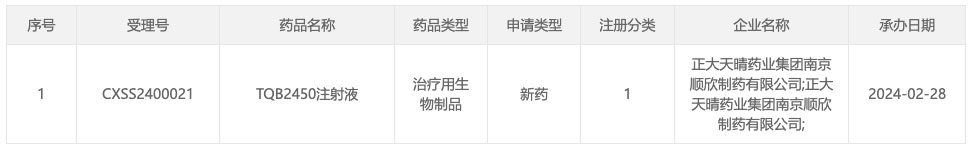 2 月 28 日,据 CDE 官网显示,正大天晴 TQB2450 新适应症申报上市(受理号:CXSS2400021)。