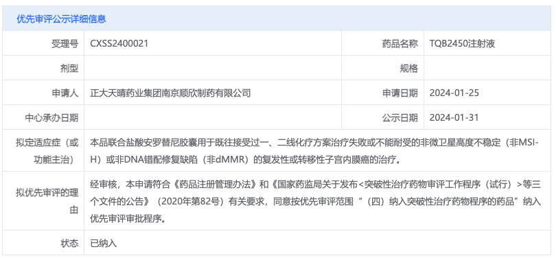 此前已被纳入优先审评,适应症为:联合盐酸安罗替尼胶囊用于既往接受过一、二线化疗方案治疗失败或不能耐受的非微卫星高度不稳定(非 MSI-H)或非 DNA 错配修复缺陷(非 dMMR)的复发性或转移性子宫内膜癌的治疗。
