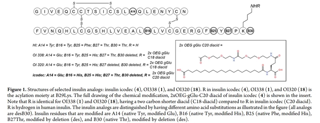 icodec是诺和诺德在口服胰岛素OI338的基础上设计的一款超长效胰岛素制剂,人体内半衰期长达196h。其核心设计在于:①将18C长链脂肪酸替换为20C长链脂肪酸,提高分子与人血清白蛋白的结合亲和力;②将B链16位Tyr(酪氨酸)替换为His(组氨酸),降低分子对人胰岛素受体的亲和力。该产品也已在美国和中国递交上市申请(见:每周1次!诺和诺德超长效胰岛素icodec申报上市)。